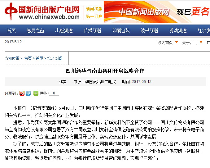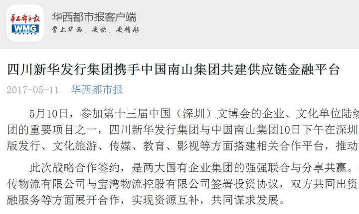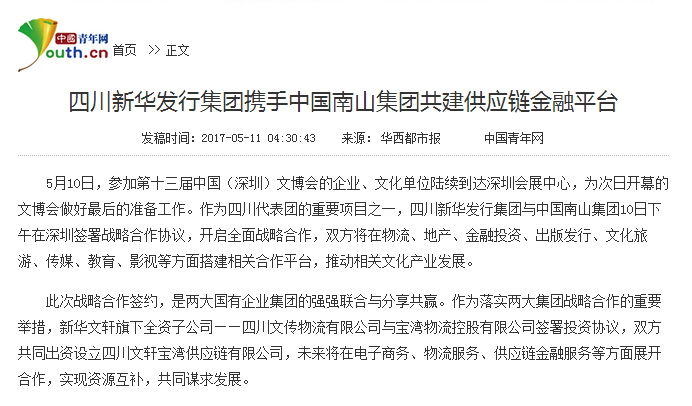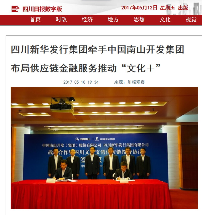 原文标题:四川新华发行集团牵手中国南山开发集团 布局供应链金融服务推动“文化+”